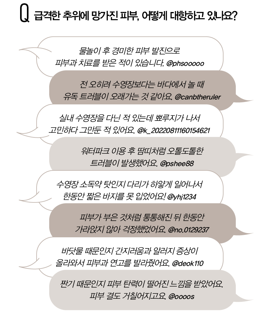 2 따끔따끔, ‘물’ 때문이야! 수영장도 예외는 아니다. 수영장 물은 미생물의 성장을 억제하려고 염소 및 브롬 등의 화학물질을 이용해 소독하는데, 피부가 예민한 사람에게는 접촉성 피부염을 유발할 수도 있다. 게다가 피부가 계속 젖어 있는 환경에서는 균이나 소독제에 대한 방어력이 약해진다. 미파문피부과 문득곤 원장은 “실제로 휴가철이 지나고 피부과를 내원하는 환자 중 대다수가 ‘물’로 인한 피해 증상을 호소한다”고 답했다. 오염된 물속 세균과 염소 같은 소독제가 피부를 자극하거나 젖은 의복이 계속 피부에 접촉해 생기는 수인성 모낭염, 접촉 피부염, 무좀, 사마귀, 농가진 등 전염성 피부 질환을 호소하는 사람이 늘어난다고.