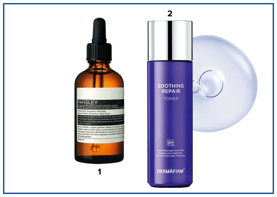 1 이솝 파슬리 씨드 안티 옥시던트 인텐스 세럼 피부가 숨 쉴 수 있도록 유해 환경으로부터 피부를 보호하는 홍조류, 타라검 추출물이 편안하면서도 효과적인 장벽을 형성한다. 60ml 10만7000원. 2 더마펌 수딩 리페어 토너 R4 리포솜화한 진정 효능 성분을 피부 깊숙이 전달해 피부 장벽을 촘촘하게 케어한다. 200ml 3만1000원.
