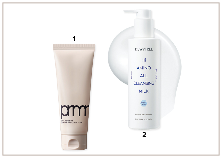 1 프리메라 오가니언스 BR 컴포트 아미노 리치폼 스킨케어링 성분을 담아 피부 장벽 방어력을 높이고 자극받은 피부를 빠르게 진정시킨다. 150ml 2만3000원. 2 듀이트리 하이 아미노 올 클렌징 밀크 부드러운 밀크 제형이 메이크업은 물론 초미세먼지까지 자극 없이 한 번에 닦아낸다. 땅김 없이 촉촉한 것 또한 장점. 200ml 1만9000원.