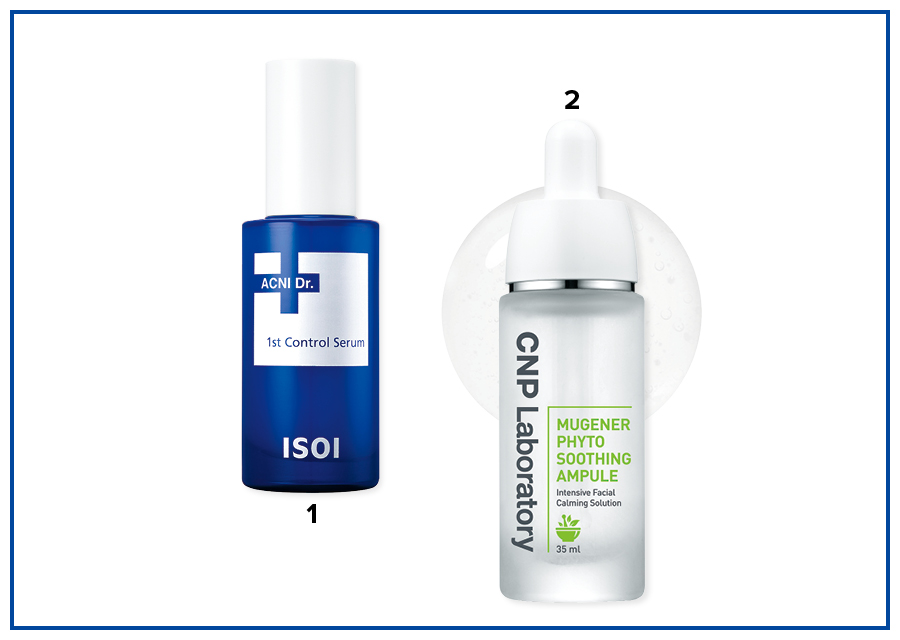 1 아이소이 아크니 닥터 퍼스트 컨트롤 세럼 빠른 진정은 물론, 피부 고민 유발 3대장으로 꼽히는 피지 분비, 건조함, 각질까지 한 번에 관리하는 응급 진정 세럼. 40ml 3만2000원. 2 CNP 뮤제너 피토 수딩 앰플 피부 수분 유지와 보습 효능은 물론 상처 치유와 염증 억제 등의 효능으로 지치고 자극받은 피부를 진정시킨다. 35ml 4만원.