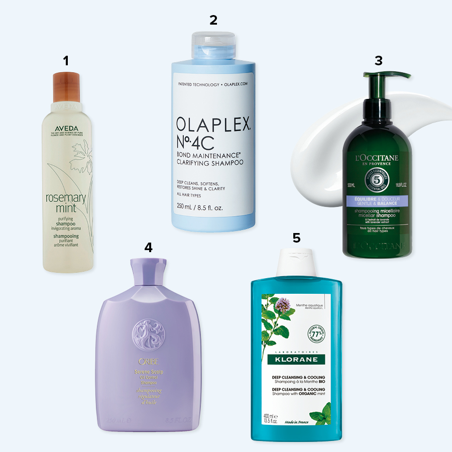 1 아베다 로즈메리 민트 샴푸 천연 산화 방지제가 포함되어 모발을 풍성하게 하고, 페퍼민트가 두피를 시원하게 해준다. 250ml 2만9000원. 2 올라플렉스 NO.4C 본드 메인터넌스 클래리파잉 샴푸 모발에 남아 있는 중금속, 기름, 화장품 등의 불순물을 제거하고, 두피 깊숙한 곳까지 노폐물을 깨끗하게 닦아 모발을 부드럽게 만들어준다. 250ml 4만3000원. 3 록시땅 젠틀&밸런스 미셀라 샴푸 에센셜 오일 5가지에 프로바이오틱스를 함유해 바람, 열, 추위 등과 같은 외부 자극으로부터 두피와 모발을 보호하고 pH의 자연적인 균형 유지에 도움을 준다. 500ml 4만5000원. 4 오리베 세린 스칼프 오일 컨트롤 샴푸 오일 컨트롤 샴푸가 녹조류 및 프리바이오틱스 혼합물을 이용해 두피를 부드럽게 세정하고, 건강한 두피로 가꿔준다. 250ml 7만9000원. 5 클로란 아쿠아민트 딥클렌징 쿨링 샴푸 항산화 작용과 정화 기능이 뛰어난 아쿠아민트 성분과 식물 유래 계면활성제로 자극 없이 세정력이 좋으며, 샴푸하는 순간 개운하게 느껴지는 온도감이 특징이다. 400ml 2만6000원.