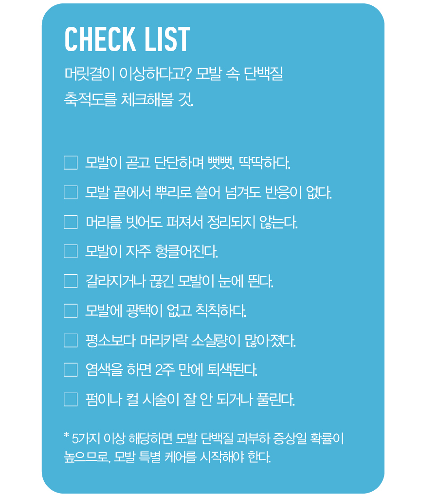단백질 과부하의 가장 큰 원인은 단백질 헤어 제품의 남용이다. 문득곤 원장은 모발 단백질 과부하 증상을 개선하는 방법으로 “단백질 제품을 권장량 이상 사용하지 말라”고 말한다. 단백질이나 아미노산 성분이 함유된 제품이라면 제품 하나만 사용하거나 사용 빈도를 낮춰야 한다. 2주에 한 번, 모발 타입에 맞는 순한 클래리파잉 샴푸를 사용하는 것도 도움이 된다. 단, 단백질을 헹구기 위해 머리를 너무 자주 감거나 과도하게 컨디셔닝하는 건 추천하지 않는다. 에센셜 오일을 사용해 모발 뿌리에 남은 단백질을 제거하는 것도 방법이다. 페퍼민트나 클라리세이지, 라벤더 오일 등을 바르면 과도한 단백질이 어느 정도 정화되고 모발에 수분을 공급해 자연스러운 탄력을 회복할 수 있기 때문이다. 모발에 단백질을 공급하고 싶으면 음식으로 섭취하길 추천한다. 생선, 우유, 육류 등 단백질 식품 외에 비타민 A가 풍부한 장어, 달걀노른자, 녹황색 채소는 케라틴 형성에 도움을 주고, 철, 요오드, 칼슘이 함유된 해조류나 견과류 등의 미네랄은 두피의 신진대사를 높여 모발에 윤기를 내는 데 효과적이다.