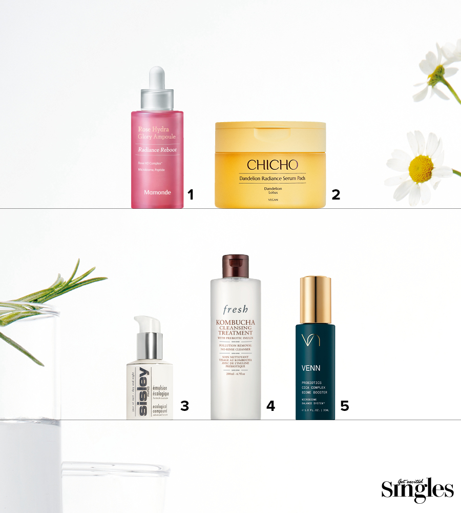 1 마몽드 로즈 하이드라 글로리 앰플 50ml 3만6000원. 2 시초 단델리온 래디언스 세럼 패드 210g 2만5000원. 3 시슬리 에뮐씨옹 에꼴로지끄 어드밴스드 포뮬라 125ml 33만원. 4 프레쉬 콤부차 트리트먼트 토너 200ml 6만6000원. 5 벤스킨케어 프로바이오틱스 시카 콤플렉스 바이오 부스터 30ml 23만5000원.