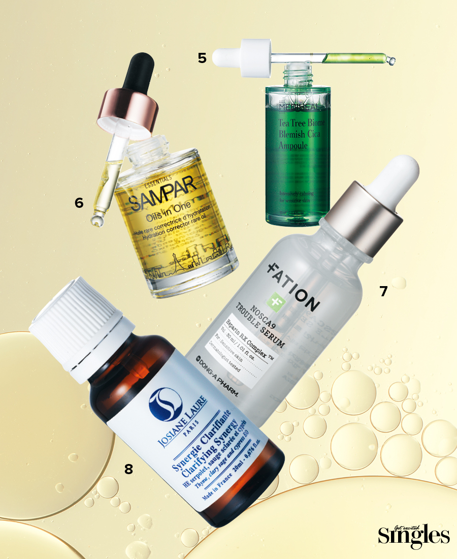 5 메디힐 티트리바이옴 블레미쉬 시카 앰플 진정 효과가 탁월한 티트리, 병풀, 마데카소사이드를 피부 친화적인 리포솜 캡슐에 담아 고민 부위까지 빠르고 안전하게 전달한다. 50ml 2만9000원. 6 쌍빠 오일즈 인 원 피부의 광채를 되찾아주는 페이스 오일로 재생, 영양 그리고 속땅김까지 예방한다. 또한 93% 천연 유래 성분으로 이루어져 있다. 30ml 4만3000원. 7 파티온 노스카나인 트러블 세럼 모공을 막지 않는 가벼운 세럼 포뮬러로 판테놀, 사과 추출물 그리고 독자 개발한 헤파린 RX 콤플렉스™가 트러블을 급속 케어한다. 30ml 2만4000원. 8 조지앙 로르 시네르지 끌라리피앙뜨 피부를 정화시켜 톤을 맑게 밝혀주 고, 윤기를 되찾아주는 에센셜 오일. 각종 스폿과 트러블 자국 완화에 도움을 준다. 20ml 8만3000원.