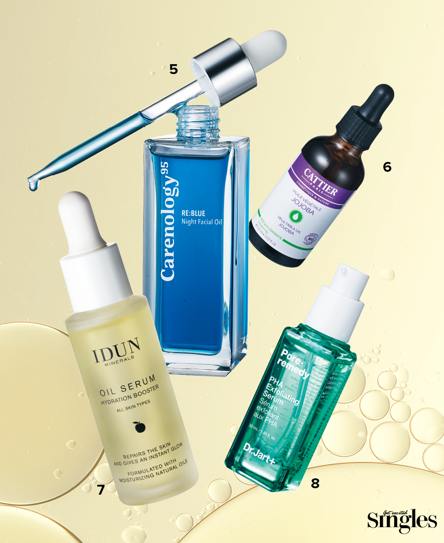 5 케어놀로지 리블루 나이트 페이셜 오일 오일 특유의 번들거림이나 무거움 없이 낮 동안 손상받아 흐트 러진 피부 리듬의 균형을 밤사이 바로잡는다. 50ml 8만4500원. 6 까띠에 베지터블 호호바 오일 by 온뜨레 사람의 피지 성분과 유사한 호호바 오일 속 왁스 에스테르 성분이 세포 간 지질 역할을 대신해 피부 장벽을 튼튼하게 한다. 50ml 3만5000원. 7 이든미네랄 비건 오일 세럼 피부가 꼭 필요로 하는 내추럴 오일 성분만을 담아 기름지지 않고 빠르게 흡수된다. 30ml 6만2000원. 8 닥터자르트 포어레미디 파하 익스폴리에이팅 세럼 모공을 막지 않는 마카다미아씨 오일과 에센스를 2층상 제형으로 구현함과 동시에 각질 제거에 탁월한 PHA를 함유했다. 30ml 4만4000원.