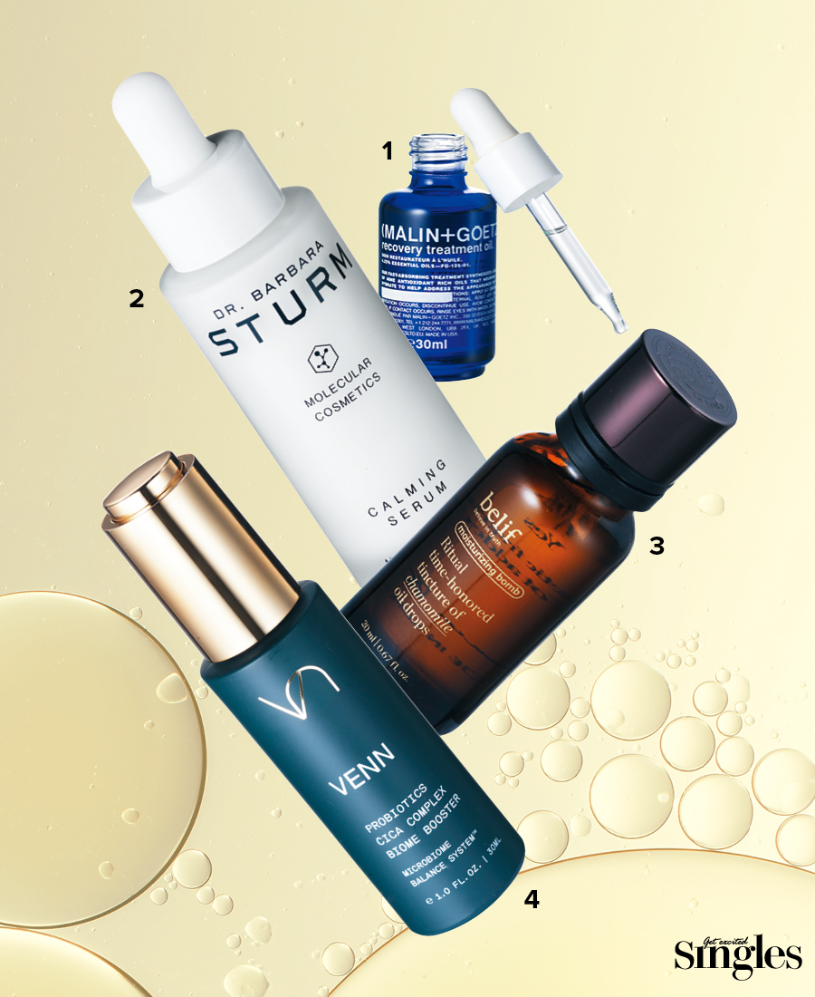 1 멜린앤게츠 리커버리 트리트먼트 오일 예민한 피부에도 안심하고 사용할 수 있는 달맞이꽃, 호호바, 로즈힙 등이 메인이다. 30ml 12만2000원. 2 닥터 바바라 스텀 카밍 세럼 식물성 기반의 활성 성분이 가득찬 진정 세럼은 자극받은 피부를 진정시키고, 쇠비름은 눈에 보이는 자극으로 인한 징후를 줄인다. 30ml 32만9000원. 3 빌리프 리추얼 타임-아너드 팅쳐 오브 카모마일 오일 드롭스 분자 크기가 작은 오일이 피부 속 수분을 촘촘히 채우고, 분자가 큰 오일은 표면에 막을 형성해 피부결을 매끄럽게 한다. 20ml 3만 3000원. 4 벤스킨케어 프로바이오틱스 시카 콤플렉스 바이옴 부스터 고농축 프로바이오틱스와 신바이 오틱스 발효 포뮬러가 장벽을 강화하고 수분 보호막을 강화시킨다. 30ml 19만5000원.