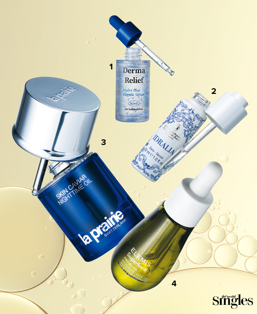 1 닥터방기원 더마 릴리프 하이드라 블루 캡슐 세럼 피부에 흡수되면서 비타민 B 5 로 변하는 판테놀이 핵심 성분. 캡슐이 터지면서 수분 보습막을 형성한다. 30ml 2만8000원. 2 산타마리아노벨라 이드랄리아 세럼 세안 후 5방울의 세럼을 마사지하듯 흡수시킬 것. 피부에 산뜻하게 스며들어 수분을 채우면서 민감 해진 피부를 다독인다. 30ml 8만2000원. 3 라프레리 스킨 캐비아 나이트타임 오일 잠들기 전, 스킨케어 마지막 단계에 사용하면 활성화 성분이 작용해 피부의 수분 장벽을 밤새 유지시킨다. 20ml 73만5000 원. 4 엘레미스 슈퍼푸드 페이셜 오일 항산화 성분이 가득한 9가지 슈퍼푸드 에센스를 블렌딩한 오일. 수분과 영양을 빠르게 충전한다. 15ml 7만2000원.